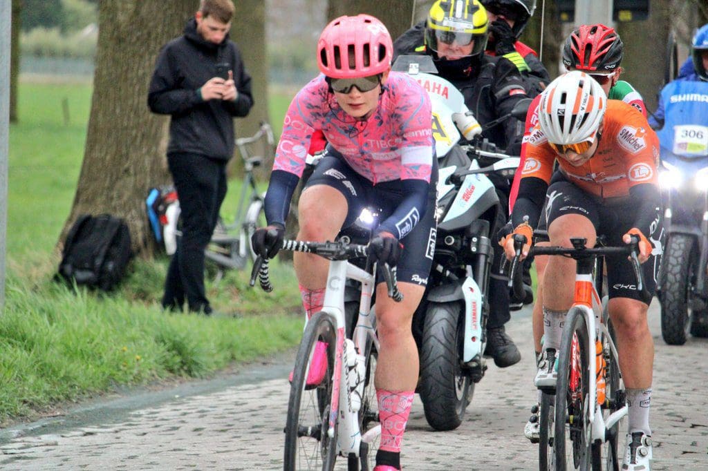 The act of joining the back of the EF Education train wasn’t simple as Dani de Francesco was already there. Manly was slightly helped by the catch of Amanda Spratt and the slight movement to the right of Abi Smith at the front of the EF Education-TIBCO-SVB pair. By needing to avoid Spratt, Manly pushes left and there is an elbow-to-elbow moment between Manly and De Francesco. As Smith moves to the right, all Manly needs to then do is hold her position and she becomes the 3rd rider in the line. Coaxing De Francesco out of the wheels and into the open air to the left of the line. Because of this move, the Zaaf rider doesn’t find any draft again until the finish straight when it’s already too late.