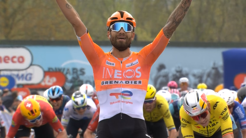 Filippo Ganna of Ineos Grenadiers won Dwars door Vlaanderen 2026 on Wednesday, catching Wout van Aert inside the final hundred metres in Waregem after a dramatic finale that swung repeatedly between a solo victory for the Belgian and a reduced sprint from the chase behind. Van Aert had forced the race open with a trademark long-range move and looked close to ending his wait for a major cobbled win, but Ganna timed his effort perfectly in the final kilometre to snatch victory at the last possible moment. Ganna becomes the first Italian to win Dwars Door Vlaanderen since Oscar Gatto in 2013.