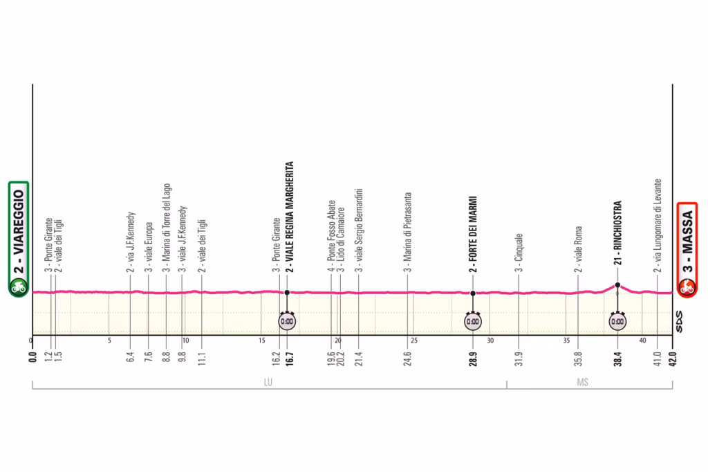 After the second rest day, the Giro resumes with its only individual time trial: 40.2km from Viareggio to Massa. The route is flat and fast along the Tuscan coast, making it a major opportunity for the strongest time triallists to take time before the climbing-heavy second half of the race.