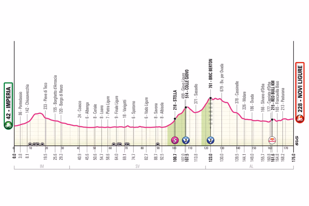 Stage 12 has been described as a reverse Milan-San Remo style stage, starting on the Ligurian coast before heading inland to Novi Ligure. Instead of the Passo del Turchino, the riders tackle the harder Colle Giovo and Bric Berton, but the final 50km of descending and flatter roads could bring the sprinters back into play.