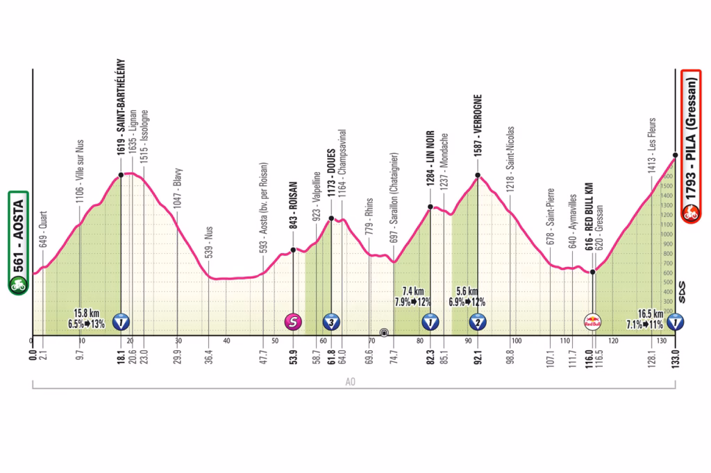 Stage 14 is short, mountainous and potentially decisive. The race covers only 133km from Aosta to Pila but includes around 4,400 metres of climbing. The route begins with the long Saint-Barthélemy climb, then uses Lin Noir and Verrogne before the 16.5km final climb to Pila.