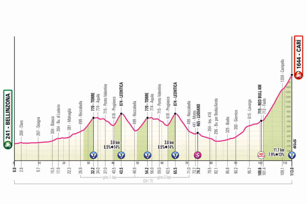 The third week begins in Switzerland with a short mountain stage from Bellinzona to Carì. It is only 113km, but the distance should make the racing more intense. The route stays entirely in Ticino, with the Leonticas climb tackled twice before the summit finish at Carì.