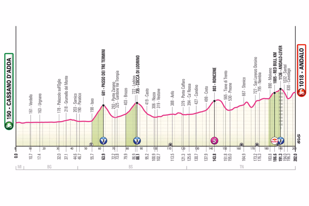 Stage 17 runs 200km from Cassano d’Adda to Andalo. It looks more like a transition or breakaway day towards the final high mountains than a pure GC showdown, but the route still climbs in the valleys near Lake Garda before reaching Andalo.