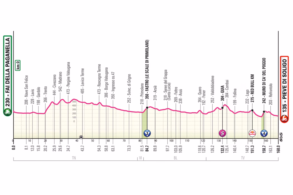 Stage 18 takes the race into Veneto and the Prosecco hills, finishing in Pieve di Soligo. The route includes the Ca’ del Poggio climb around 10km from the finish, making positioning and team strength important even if it is not a major GC mountain day.