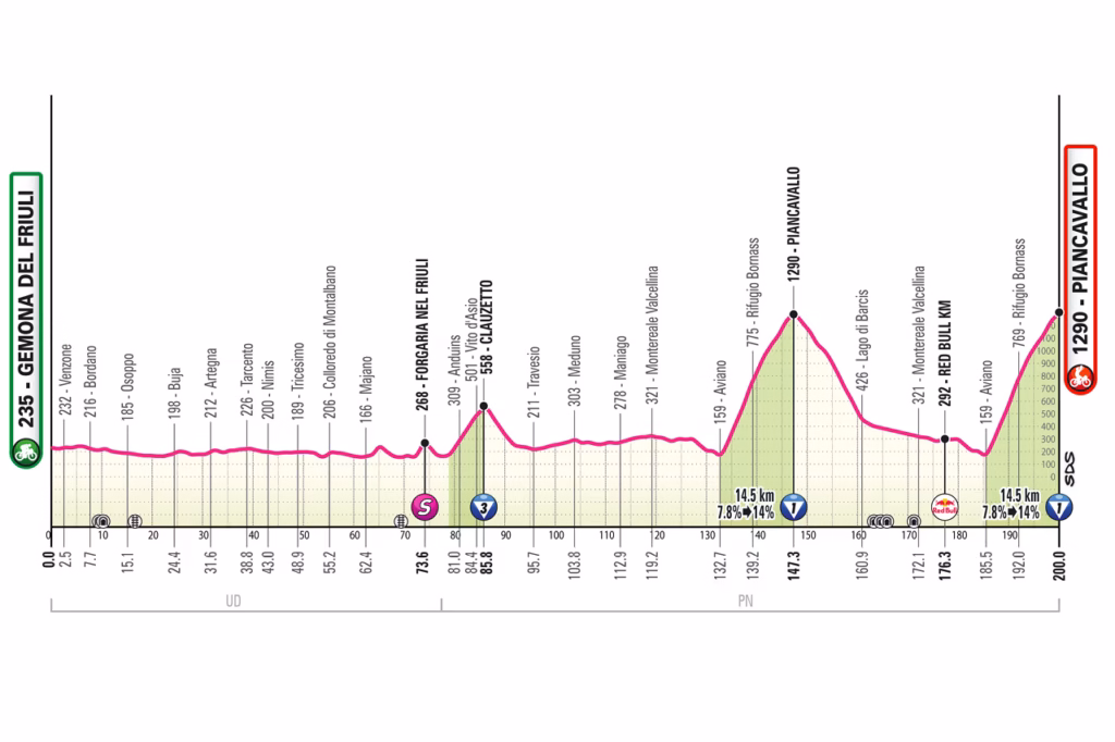 The final mountain stage runs 200km from Gemona del Friuli to Piancavallo. It commemorates the 50th anniversary of the Friuli earthquake and uses Piancavallo twice, with the final ascent coming from Aviano after around 184km. The climb is 14.4km at 8.9 per cent, steep enough to create serious differences even on the penultimate day.