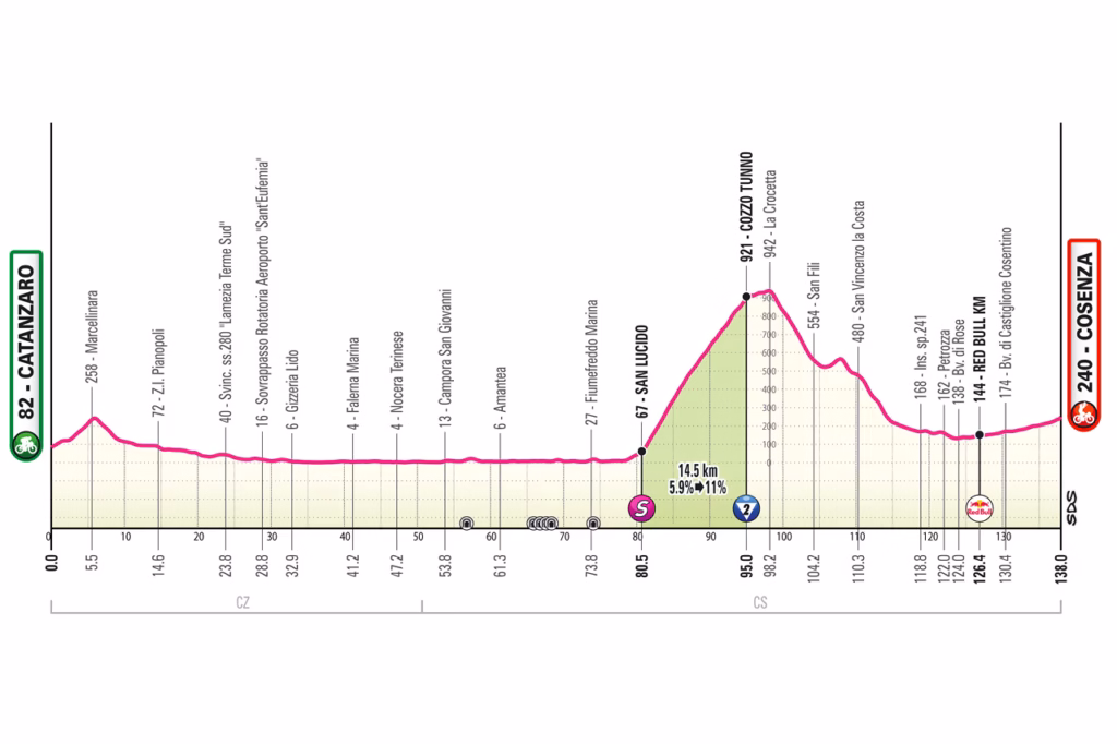 After the first rest and transfer day, the Giro resumes in Calabria with a 144km stage from Catanzaro to Cosenza. The profile is not mountainous, but the Cozzo Tunno climb after around 86km makes it more complicated than a basic flat stage.