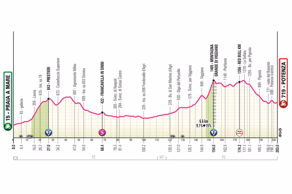 Stage 5 is one of the first really interesting medium mountain days. The race runs 204km from Praia a Mare to Potenza, with around 3,700 metres of climbing and a punchy final rise to the line.