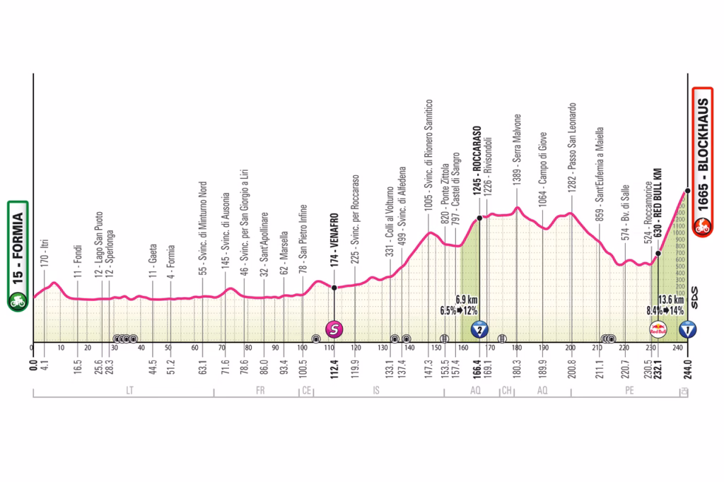 Stage 7 is the first major GC stage of the race and the longest stage of the 2026 Giro. The route from Formia to Blockhaus covers 246km, includes around 4,600 metres of altitude gain, and finishes at 1,665 metres after the steeper Roccamorice road to Blockhaus.