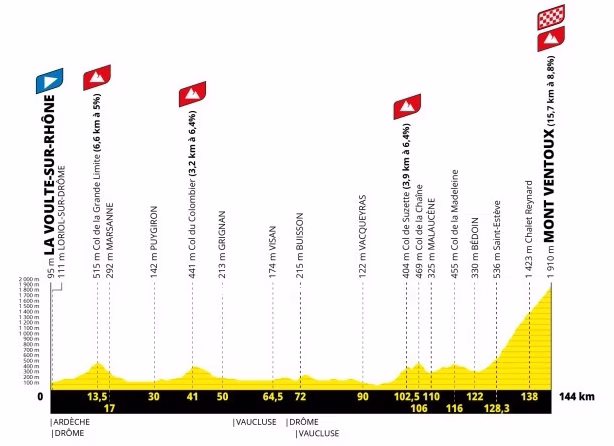 7 AugustStage 7La Voulte-sur-RhôneMont Ventoux144 kmQueen stage – summit finish atop the 15.7km climb from Bédoin to the Ventoux weather station.