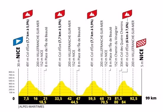 9 AugustStage 9NiceNice99 kmShort, explosive finale featuring four ascents of the Col d’Èze before finishing on the Promenade des Anglais.